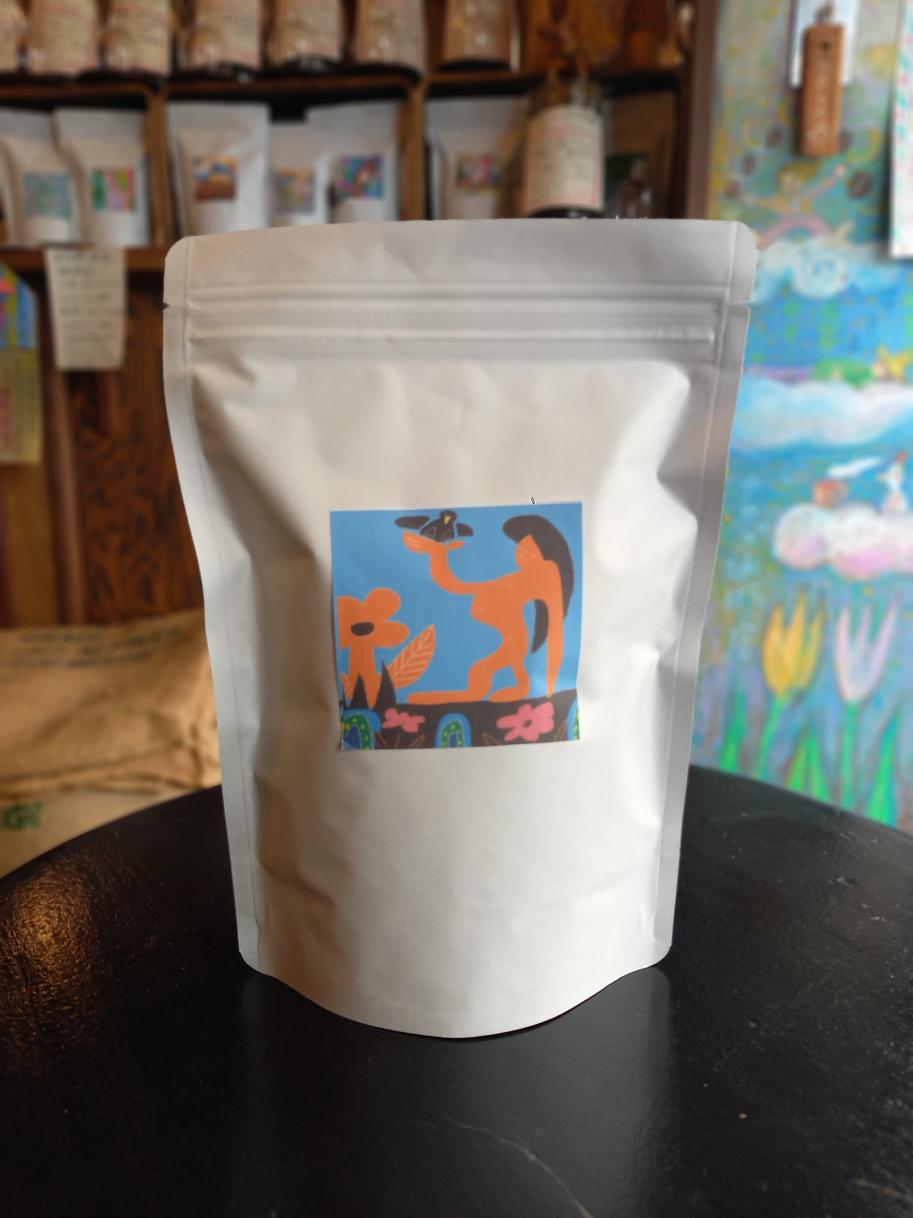 ※写真の珈琲袋は店頭用の珈琲袋です。オンラインストアーでは、発送用の平袋でお送り致します。到着しましたらお手持ちのキャニスター缶などに入れ替えるなどし、光、湿気、水気を避け、保存をお願い致します。